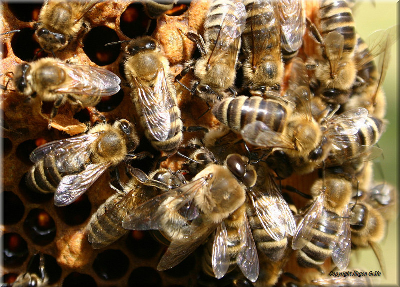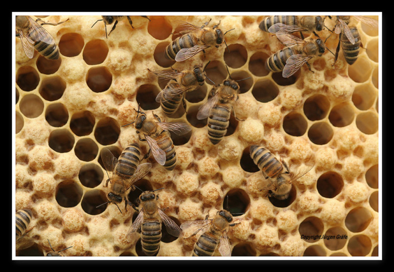 Bienenwiege, in diesen Wabenzellen wachsen Drohnen heran !
