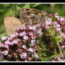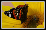 links: ein Admiral und eine Honigbiene auf einer Sonnenblume, rechts: eine Drohnenwabe. Hier sieht man die Draufsicht der Bienenwiege. (s.oben)